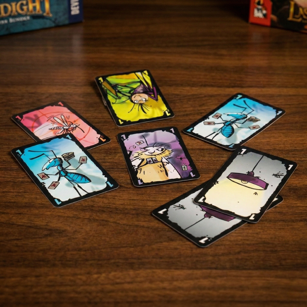 Tíralas al suelo, escóndelas en la manga, mételas bajo el tablero o lánzalas por encima del hombro. Todo vale mientras el Chinche Guardián (un jugador que vigila) no te pille. Si te ve, te quedas la carta y te conviertes en el nuevo Guardián. Fácil de aprender. Muy difícil de disimular.