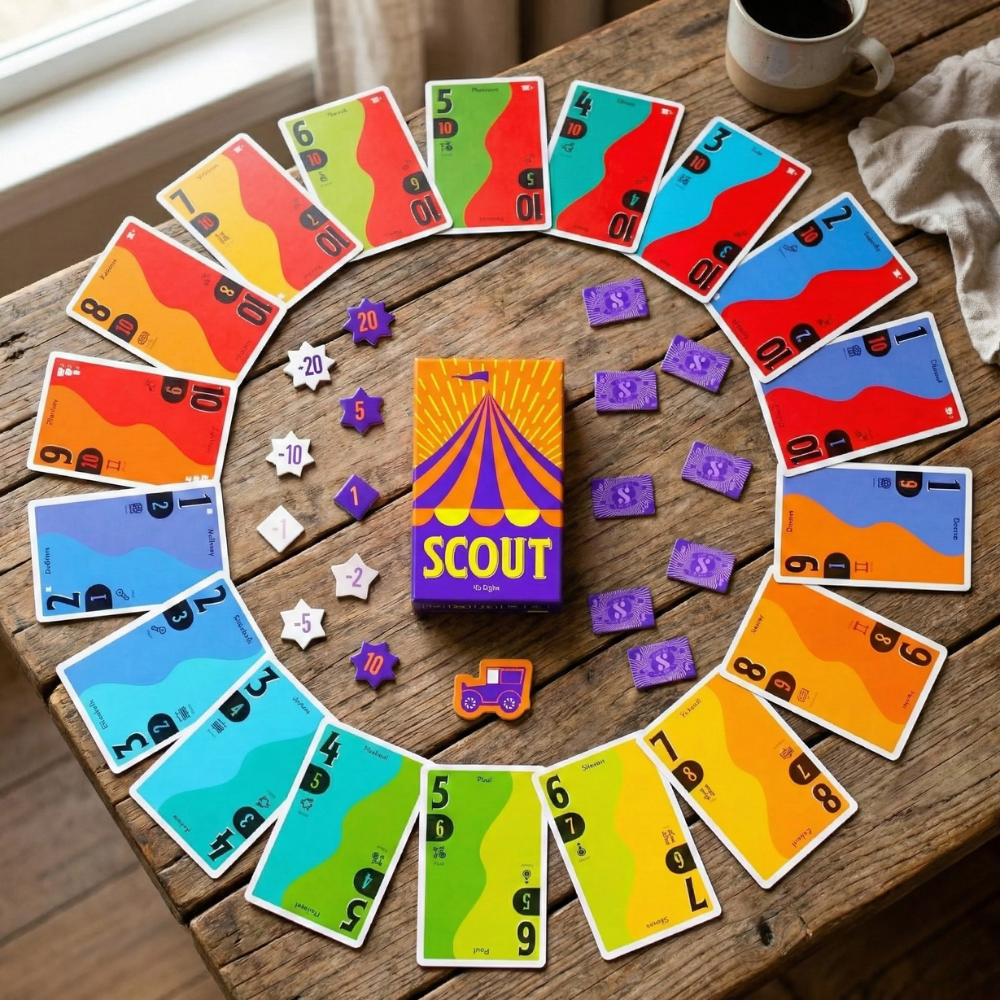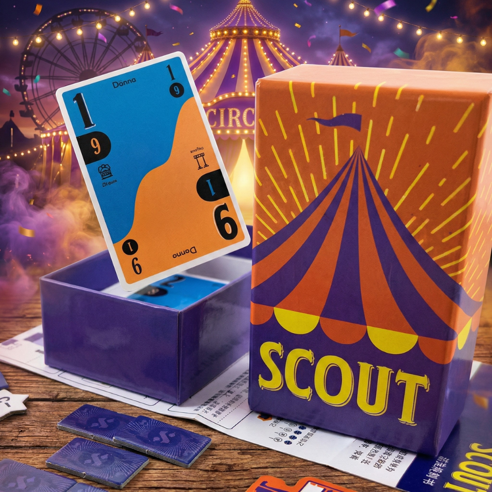 En Scout, te conviertes en el director de un circo. Tu misión es montar un espectáculo mejor que el de tus rivales. Pero hay un giro genial: no puedes reordenar las cartas de tu mano. Tal y como te las reparten, así se quedan. En cada turno tienes dos opciones: