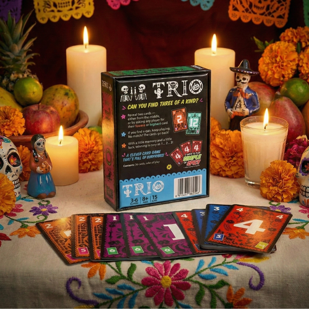 Trio no es solo un juego de cartas. Es un pequeño desafío mental disfrazado de fiesta. Con una estética vibrante inspirada en el Día de Muertos, este juego ha conquistado a grupos de amigos por ser increíblemente fácil de explicar pero imposible de soltar. Aquí no gana quien tiene la mejor mano… gana quien mejor lee la mente (y las cartas) de los demás.